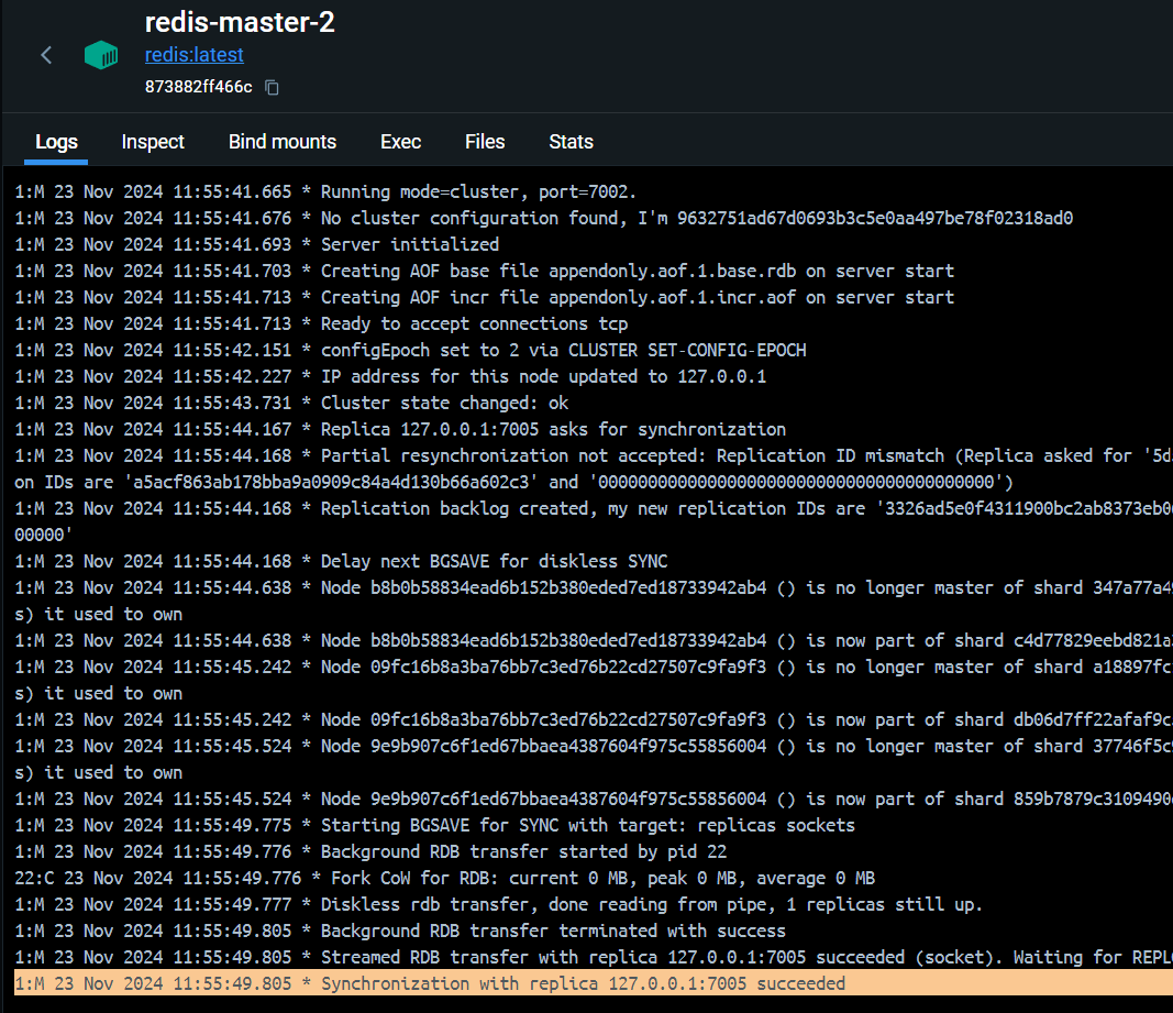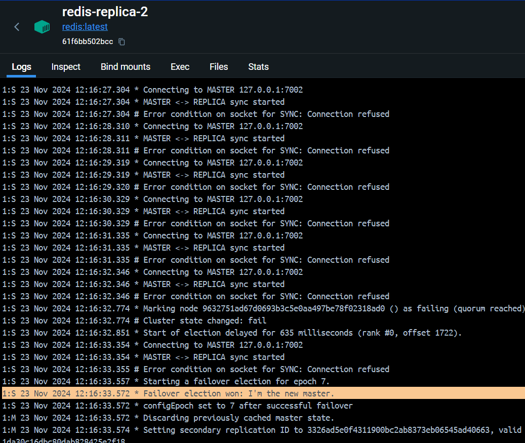마스터2 노드 컨테이너 로그 확인 시에 다음과 같이 7005 포트의 레플리카2 노드가 배정됨을 확인할 수 있다.